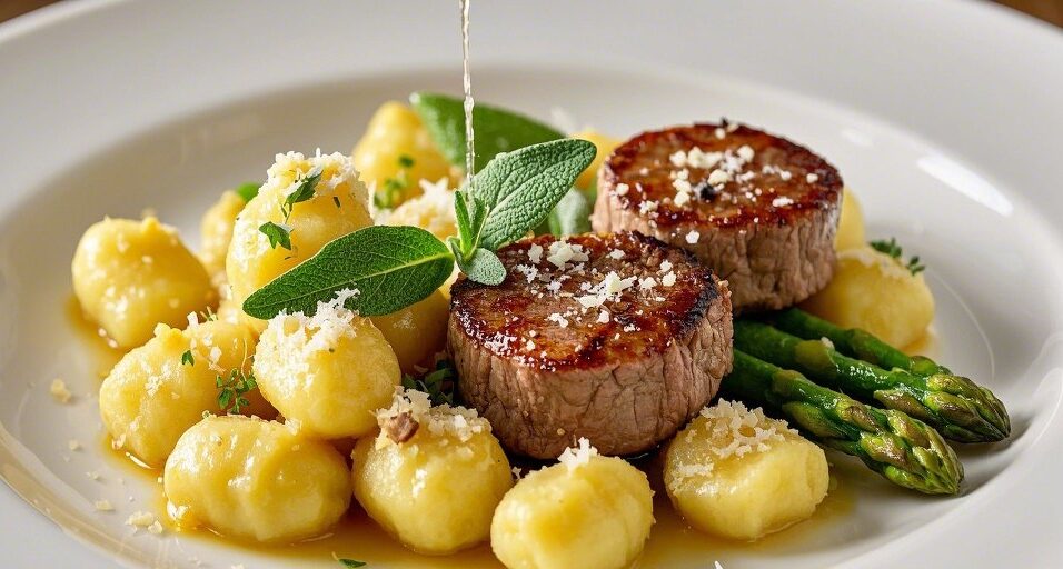 5. Finalização: Salte o nhoque na manteiga, sirva com parmesão e acompanhe com filé mignon e aspargos