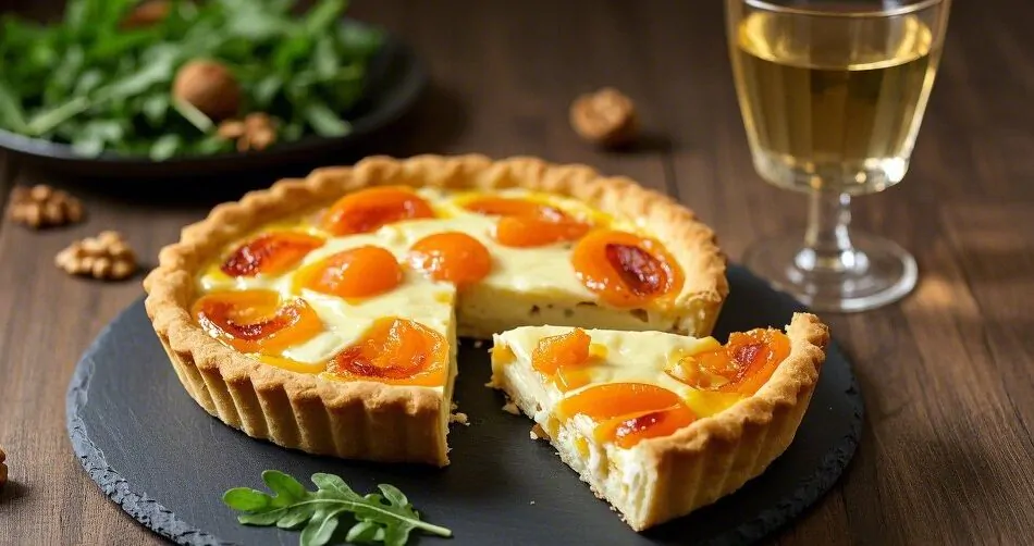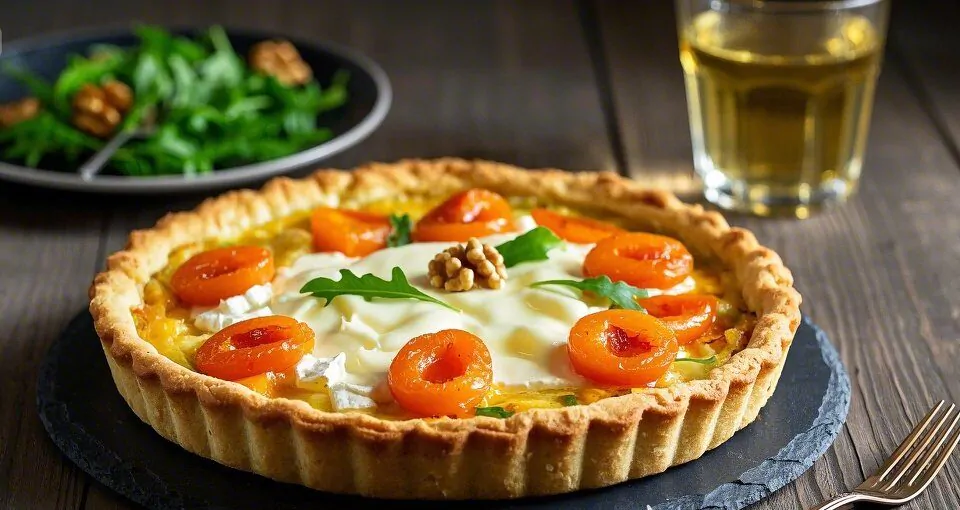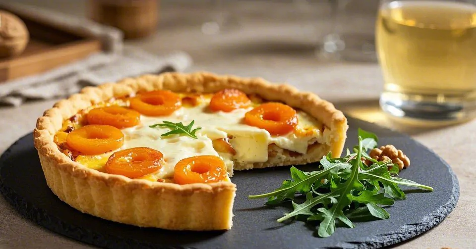: O contraste entre o queijo brie derretido e o dulçor do damasco faz dessa quiche uma experiência gastronômica única. Uma opção refinada para paladares exigentes.